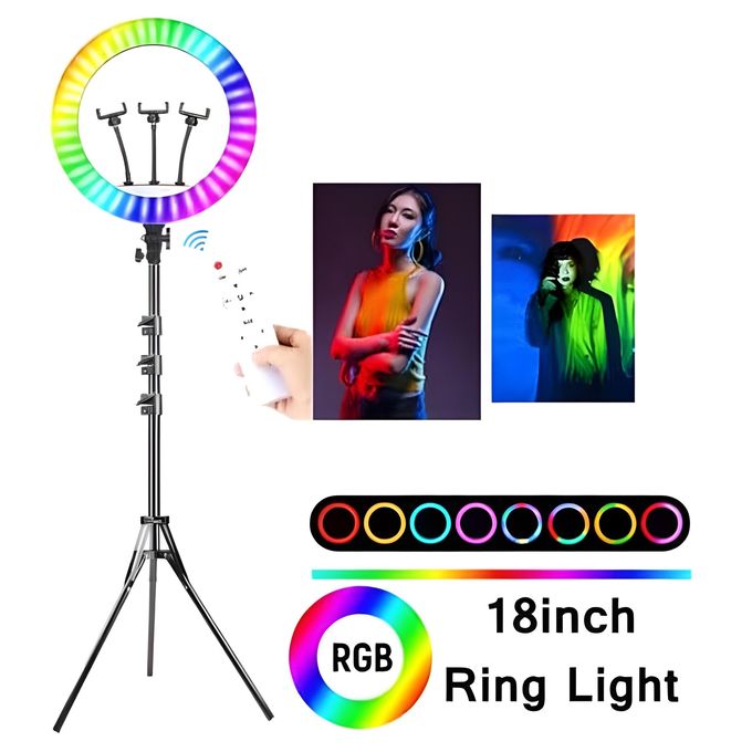 رينج لايت MJ45 – حلقة إضاءة LED – مقاس 18 بوصة / 45 سم – إضاءة RGB بـ 7 ألوان – حامل بطول 2.1 متر