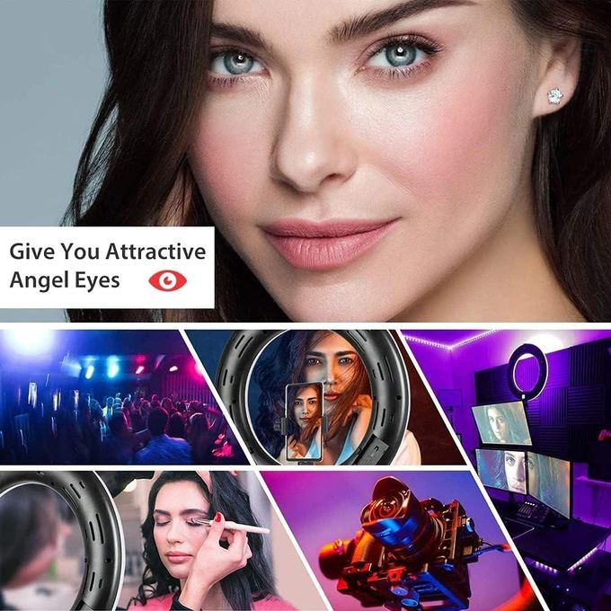 تأتي بإضاءة RGB مبهرة بـ 7 ألوان مختلفة، لتمنحك حرية الإبداع في اختيار الأجواء التي تناسبك، سواء للإطلالات الطبيعية أو المؤثرات المبهجة. كما يحتوي الطقم على حامل قوي بطول 2.1 متر، يمكن تعديله بسهولة ليلائم زوايا التصوير المختلفة، مع ضمان الثبات أثناء الاستخدام.